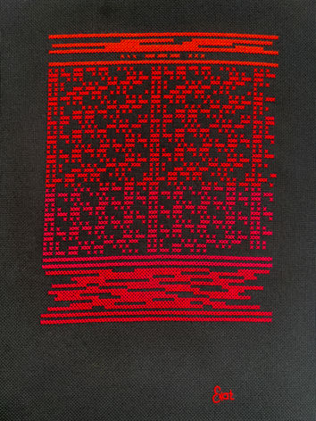 Elle adapte ces signes à sa technique de broderie, c’est-à-dire par des croix, mais en respectant